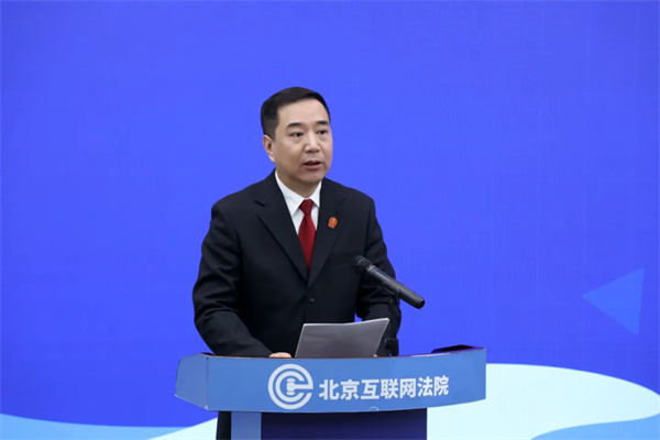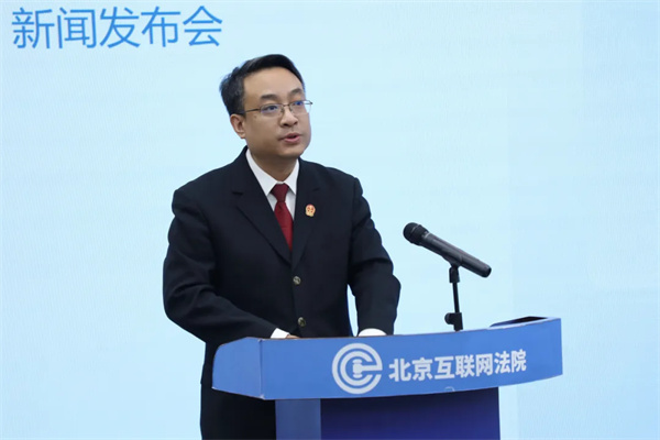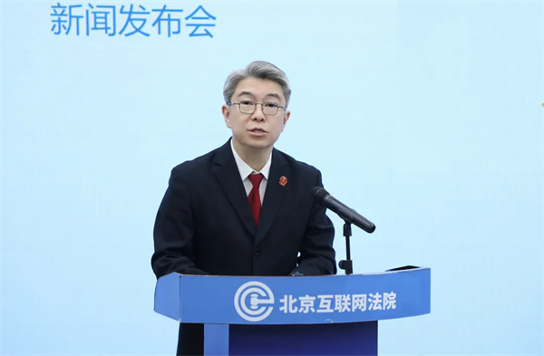 Zhang Lianyong, presiding judge of the BIC's Second Comprehensive Division, releases typical cases on false advertising of online consumption. [Photo/Beijing Internet Court]